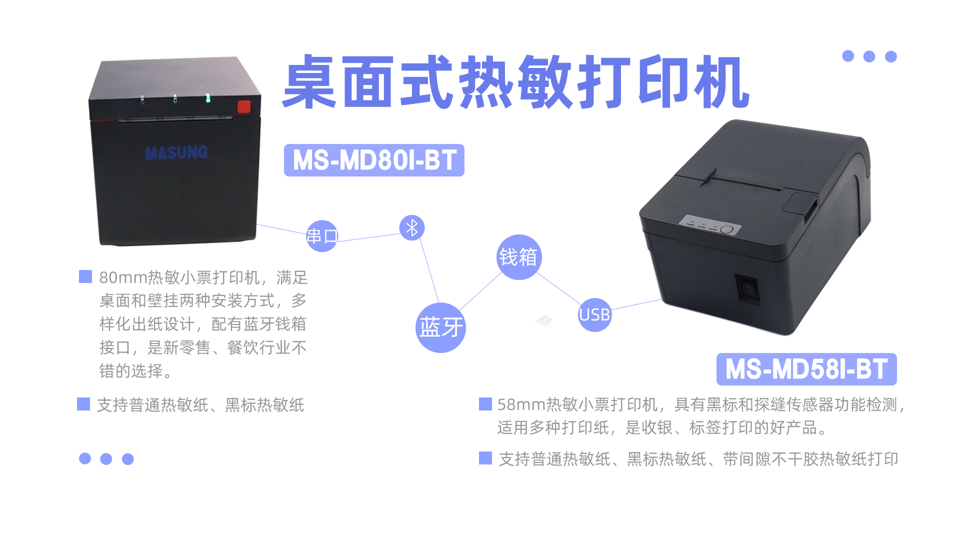 這兩款新發(fā)布的桌面小票打印機,一款是80mm熱敏小票打印機,滿足桌面和壁掛兩種安裝方式,多樣化出紙設(shè)計,配有藍牙錢箱接口,是新零售、餐飲行業(yè)不錯的選擇。另一款是58mm熱敏小票打印機,具有黑標和探縫傳感器功能檢測,適用多種打印紙(普通熱敏紙,黑標熱敏紙,帶間隙不干膠標簽熱敏紙),是收銀、標簽打印的好產(chǎn)品。