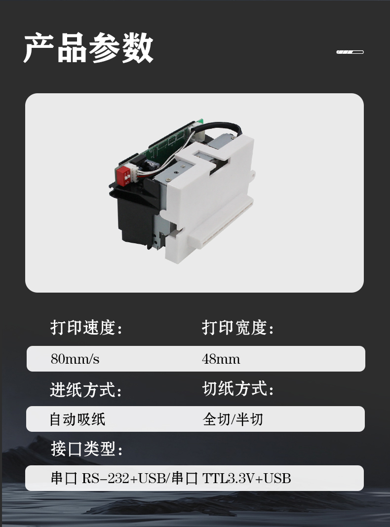 美松MASUNG自主研發(fā)58mm嵌入式熱敏打印機 1.自動進紙、自動切紙熱敏打印模組 2.黑色/白色出紙嘴安裝 3.軟件和硬件接口兼容,可增加出紙檢測、紙將盡等功能優(yōu)化 4.廣泛應用于票據打印終端、銀行終端、寄存柜等領域使用
