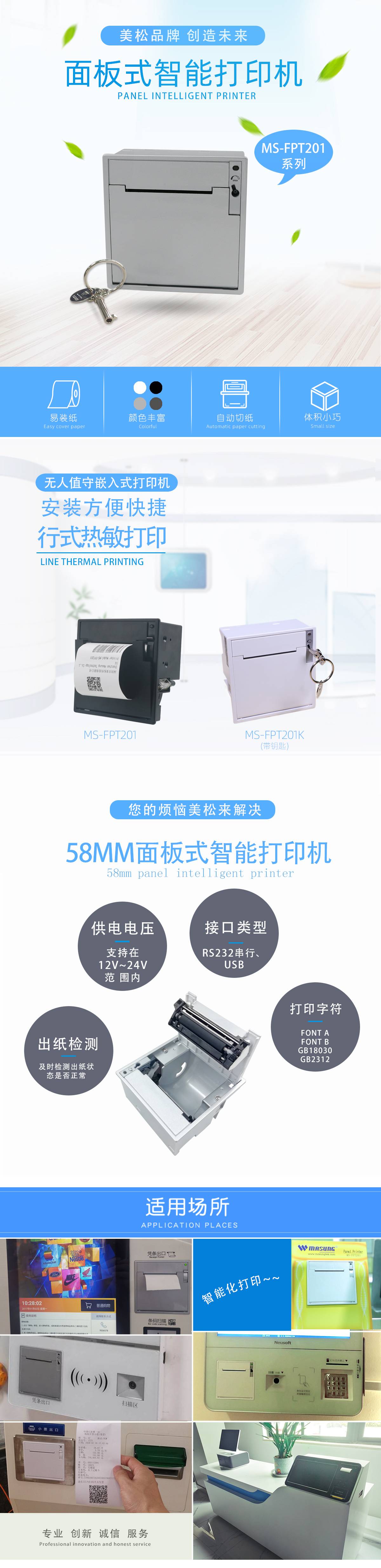 美松MASUNG自主研發58mm熱敏打印機 1.新型行式熱敏打印機 2.擁有易裝紙易維護的特點 3.支持多種條形碼的打印,包括多種一維條形碼的打印,同時支持二維碼的打印 4.應用場景:排隊機,POS機,加油站設備及醫療掛號繳費等設備