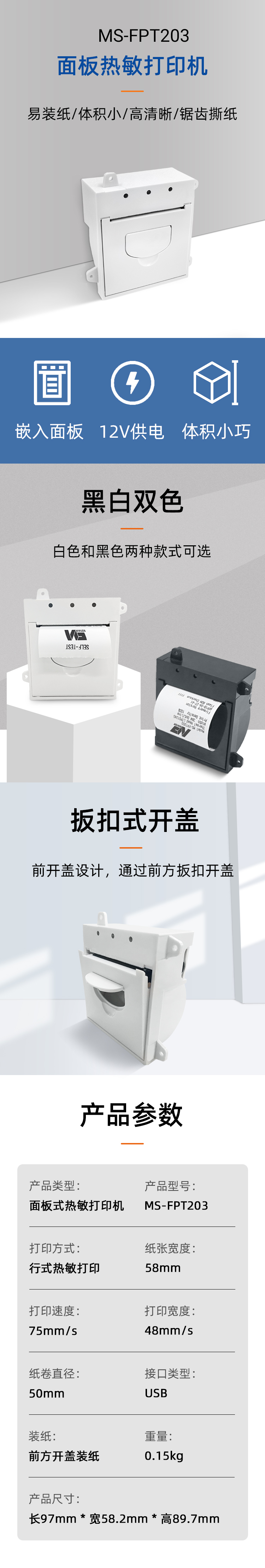微型打印機介紹:與80mm微型熱敏打印機不同,這款是58MM的微型打印機,型號為MS-FPT203微型打印機是一款58mm嵌入式微型打印機,只需要簡單安裝就能實現打印功能的打印模塊,嵌入在不同的終端設備,例如加油站、餐飲收銀機、排隊繳費機等,微型熱敏打印機是排隊機,POS機,游戲機以及儀器設備嵌入使用。