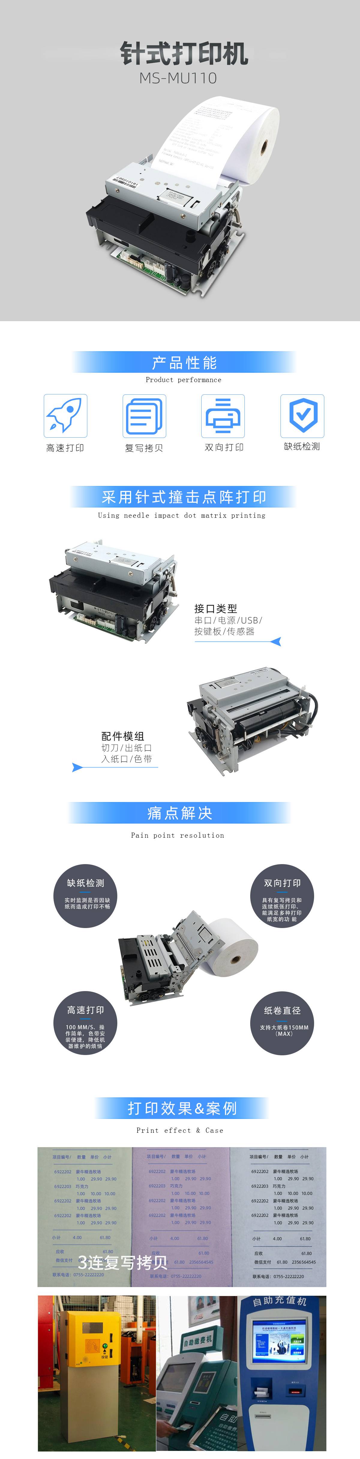 MS-MU110打印一體機是由原裝愛普生M-U110針式打印機機芯,與公司自主研發的針式打印機控制主板相結合的一款打印一體機MS-MU110,是一種針式撞擊點陣打印方式的打印機,可靠性強,打印速度快,具有復寫拷貝和連續紙張打印的功能,控制板結構小巧,操作簡單,色帶安裝便捷,降低機器維護的煩惱。