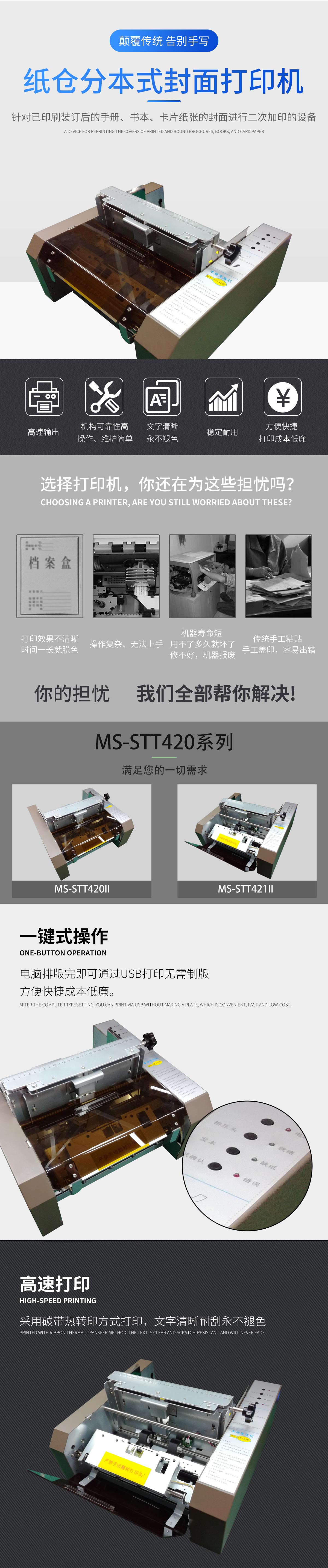 美松MS-STT420II是熱轉(zhuǎn)印設(shè)備,利用熱轉(zhuǎn)印技術(shù),實(shí)現(xiàn)紙倉(cāng)分本式封面打印機(jī)針對(duì)已印刷裝訂后的手冊(cè),書本,卡片紙張的封面進(jìn)行二次加印的設(shè)備.采用碳帶熱轉(zhuǎn)印方式打印,文字清晰耐刮永不褪色.電腦排版完即可通過USB打印無需制版,方便快捷成本低廉.可調(diào)打印件厚度及可調(diào)紙倉(cāng)式多本裝入,機(jī)構(gòu)可靠性高,操作,維護(hù)簡(jiǎn)單.