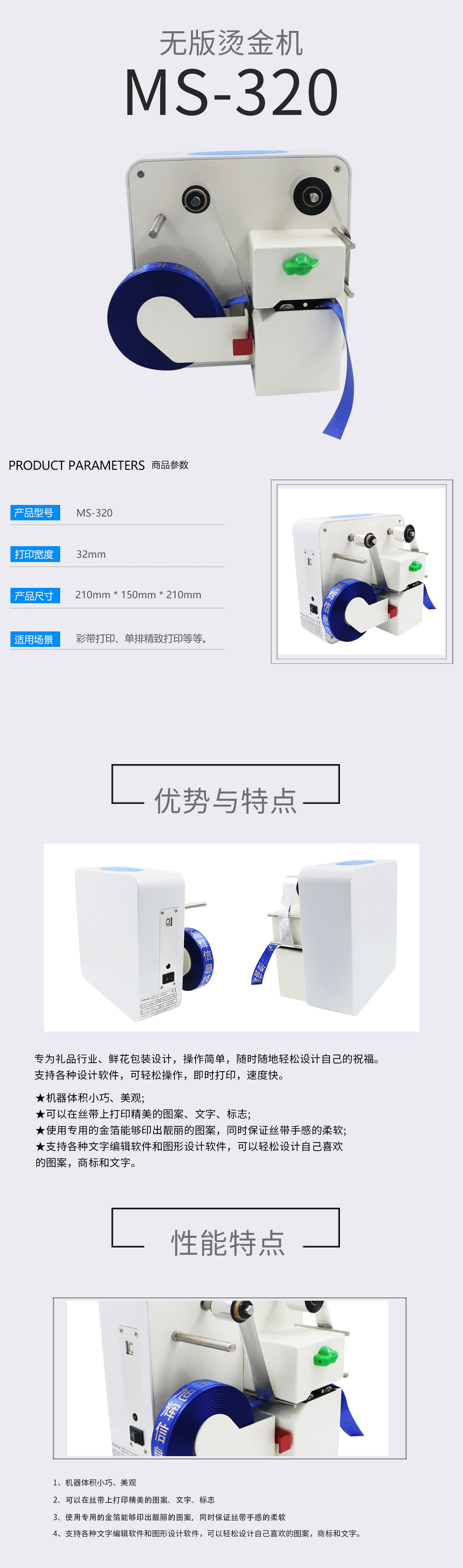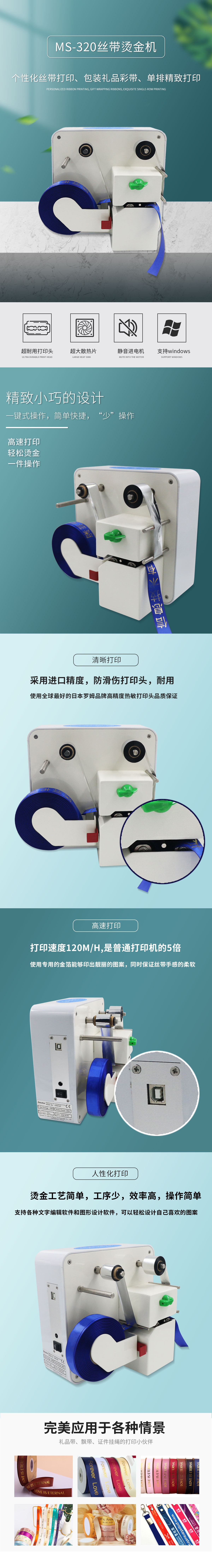 美松全自動(dòng)絲印機(jī) 1.機(jī)器體積小巧,美觀(桌面擺設(shè)) 2.速度快(是普通打印機(jī)的5倍) 3.在絲帶上打印精美的圖案,文字,標(biāo)志 4.使用專(zhuān)用的金箔能夠印出靚麗的圖案,同時(shí)保證絲帶手感的柔軟 5.支持各種文字編輯軟件和圖形設(shè)計(jì)軟件,自定義打印商標(biāo)和文字