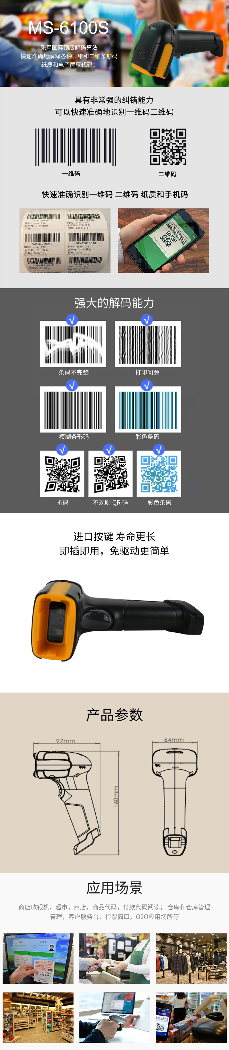 30萬像素二維有線掃描槍MS-6100S 手持式二維條碼掃描器 開票功能︰支持支付寶開票功能,方便使用 更流暢的閱讀手機(jī)支付條碼的能力∶支持支付寶,微信支付功能 開機(jī)迅速,即插即用