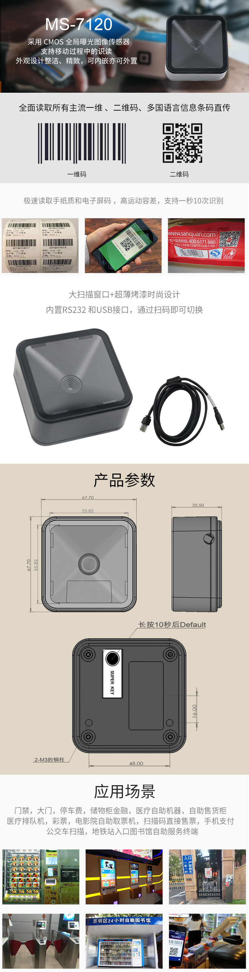 美松二維碼掃描器 1.全面讀取所有主流一維 ,二維碼,多國語言信息條碼直傳 2.物體自感應(yīng),2M/S運(yùn)動(dòng)容差,支持陽光下識讀 3.內(nèi)置RS232 和USB接口,通過掃碼即可切換 4.3.3-5V寬電壓輸入,無懼電壓波動(dòng) 5.大掃描窗口&超薄烤漆時(shí)尚設(shè)計(jì) 6.極速讀取手紙質(zhì)和電子屏碼