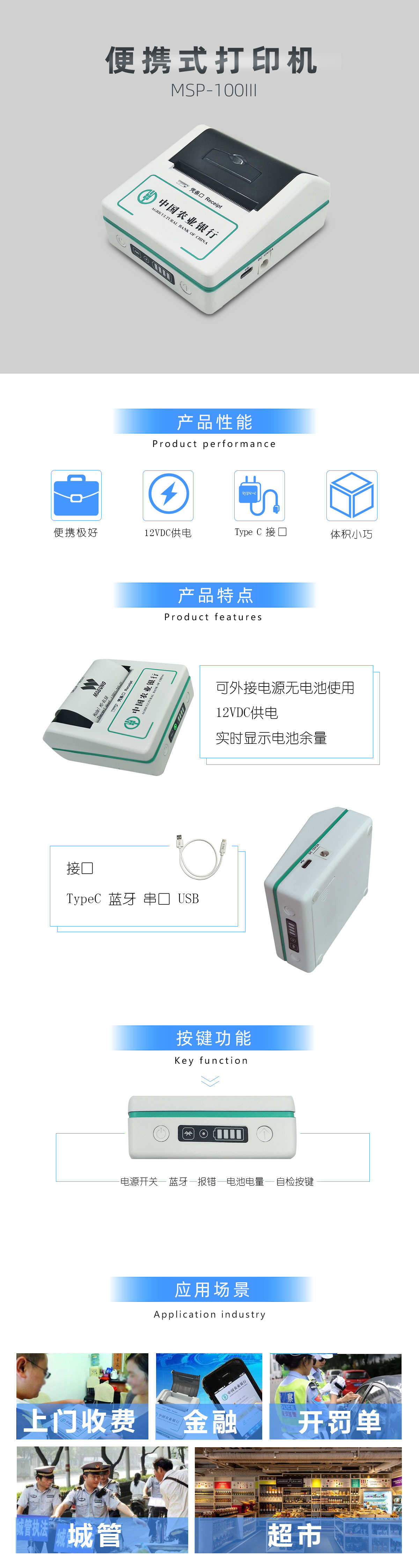 美松MASUNG自主研發便捷式打印機 1.ESC/POS?標準的命令協議 2.12VDC供電,可外接電源無電池使用 3.支持TypeC,藍牙,串口,USB接口 4.支持位圖打印,條形碼打印