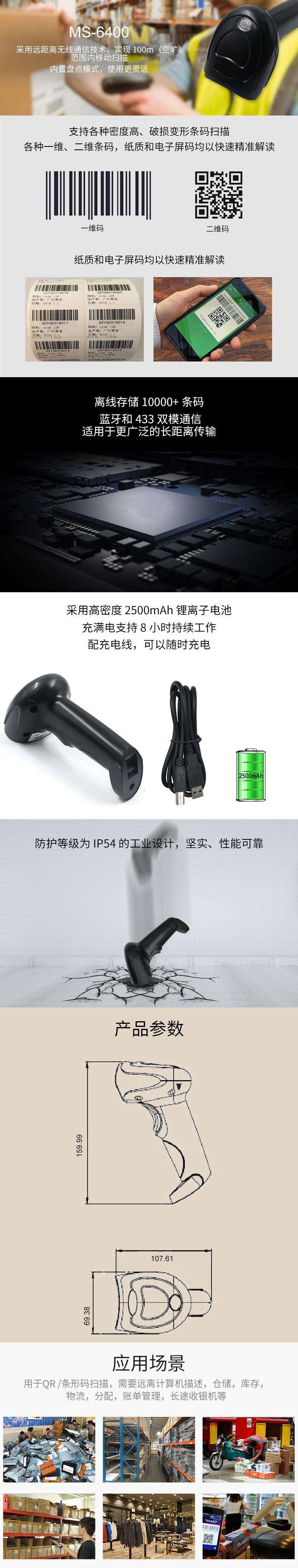 美松一二維碼影像式掃描槍MS-6400系列掃描采用遠(yuǎn)距離無線通信技術(shù),實(shí)現(xiàn)100m空曠范圍內(nèi)移動(dòng)掃描;采用高密度2500mAh鋰離子電池,充滿電支持5小時(shí)持續(xù)工作,配充電線,可以隨時(shí)充電;采用國際頂尖解碼算法,對(duì)各種一維,二維條碼,紙質(zhì)和電子屏碼均以快速精準(zhǔn)解讀;支持各種密度高,破損變形條碼掃描;非常適用于倉儲(chǔ),盤庫,物流,配送,票據(jù)管理,遠(yuǎn)距離收銀等,可選配掃描器支架.