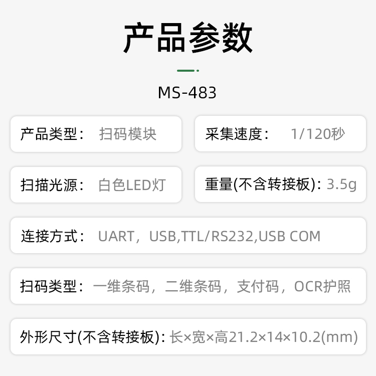 兼具一維/二維碼;紙質和手機碼掃描 3.9mil精度條碼掃描 工業級電路防護設計 十字激光光標指示 OCR身份證號碼讀取功能(選配) 選配轉接板可端子線連接RS232,TTL3.3V,TTL5V,USB,USB虛擬串口