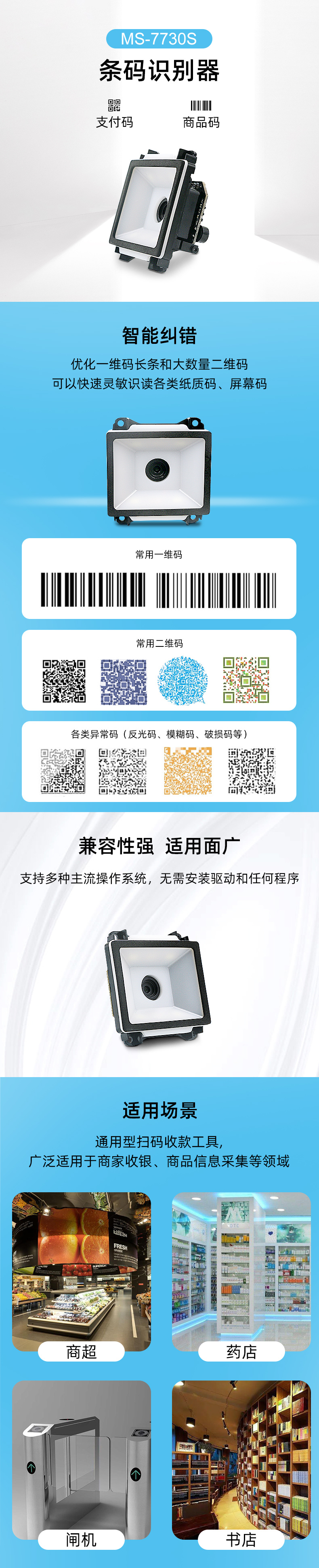 通過國家電子健康卡認(rèn)證(7730S) 兼具一維/二維碼;4mil紙質(zhì)和手機(jī)碼掃描 支持“貼面”和快速移動(dòng)過程中識(shí)讀 內(nèi)置RS232\USB接口和蜂鳴器 28MM超薄設(shè)計(jì)更宜集成 支持陽光下和完全黑暗環(huán)境識(shí)讀