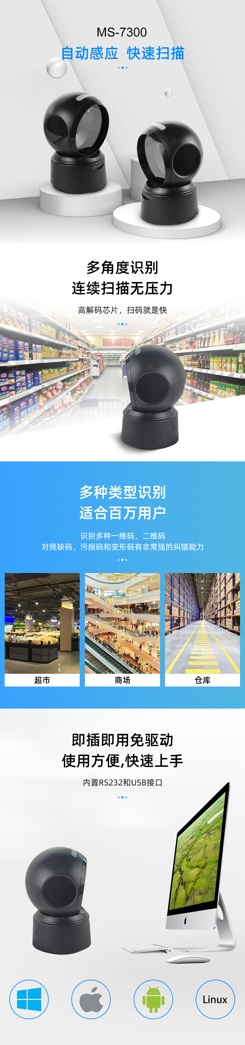 1、卓越的一維/二維條碼識讀性能 ,4M/S超高速運動容差 2、IP52 防塵等級;1.2米抗跌落 3、支持USB和RS232接口 4、支持紙質,薄膜類,商品碼,付款碼讀取 5、支付寶開票碼、國稅開票碼、航天信息、百旺金賦開票, 微信開票助手,閃電開票
