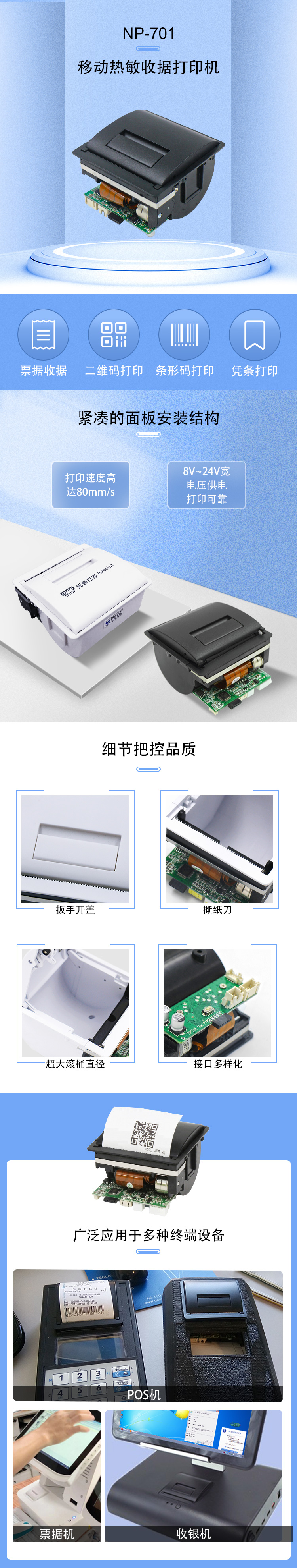 美松MASUNG自主研發58mm熱敏打印機 1.接口形式:串口(Ver02版本只支持TTL,Ver03版本支持RS232/TTL),USB 口 2.驅動支持: XP /Win7 /WIN8 (32bit 和 64bit)/win 10 3.打印速度:最高可達80mm/s 4.具有噪聲低、可靠性強,結構小巧、操作簡單、易裝紙等特點 5.8V~24V寬電壓供電 6.弧面式設計確保紙卷大,嵌入體積小 7.醫療、檢測、零售等行業的自助終端打印設備