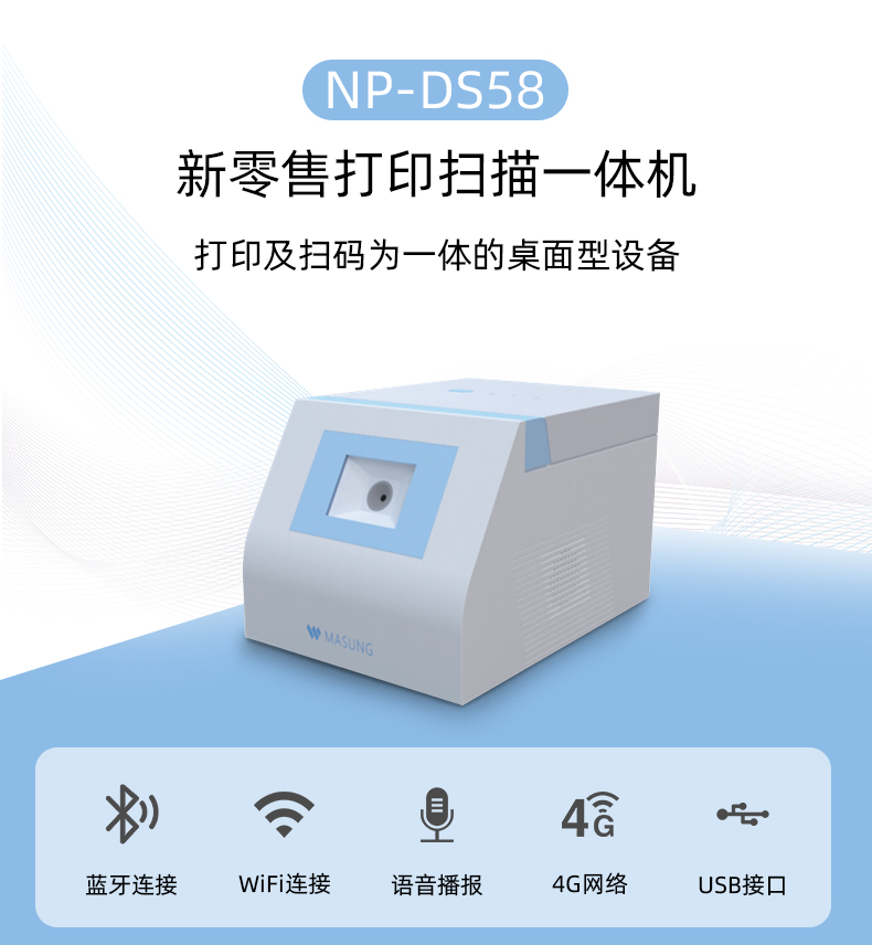 在新零售行業廣泛應用的打印掃描一體機NP-DS58,同時兼顧打印和掃描兩種功能的一體式設備,具有藍牙連接和wiff連接等連接方式,帶有4G網絡接口,和USB接口連接,收銀掃碼都十分方便,帶有語音播報功能,更方便收銀結賬。