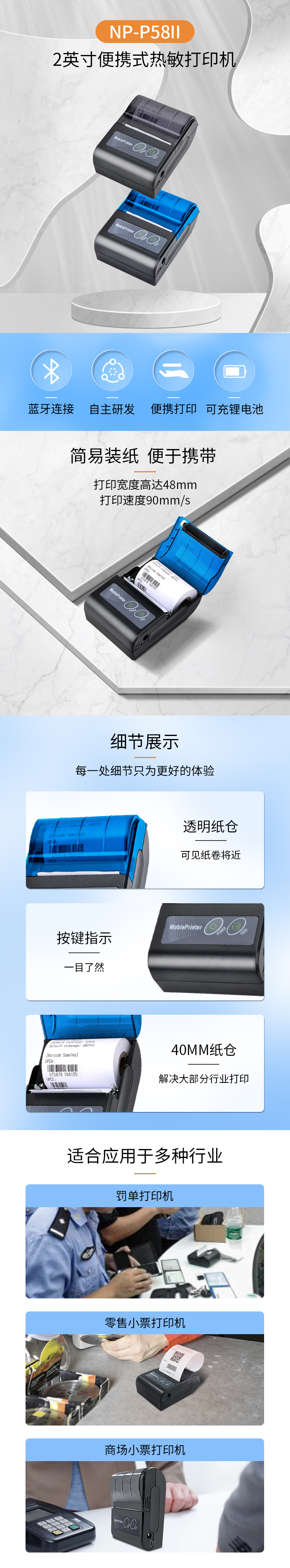 使用58mm的熱敏紙卷打印,可用于多種應用場景,餐飲小票,收銀小票,罰單等都可以打印。