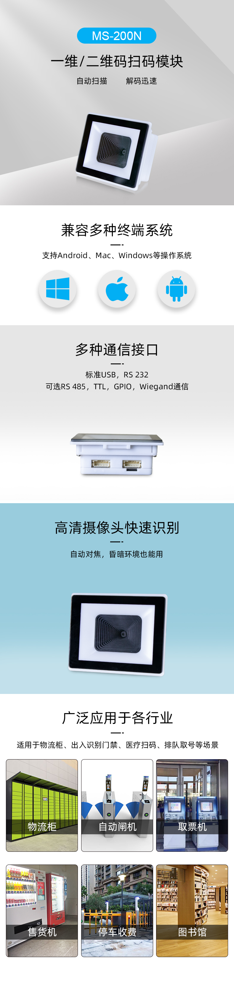 1.領先的解碼技術 采用自主研發的核心技術,極速響應, 2.讀取各種條碼 一維/二維,紙質/手機讀碼 3.寬電壓供電 默認3.61-5V供電,可選3.3-16V寬電壓電源 4.多種通訊方式 標準USB、RS232; 可選RS485、TTL、GPIO、韋根通訊 5.OCR 讀取 可讀的 OCR-A/B 數字(可選) 6.NFC 刷卡 可選刷卡模塊可支持13.56Mhz,非接觸式IC讀卡器,支持Type A/B卡