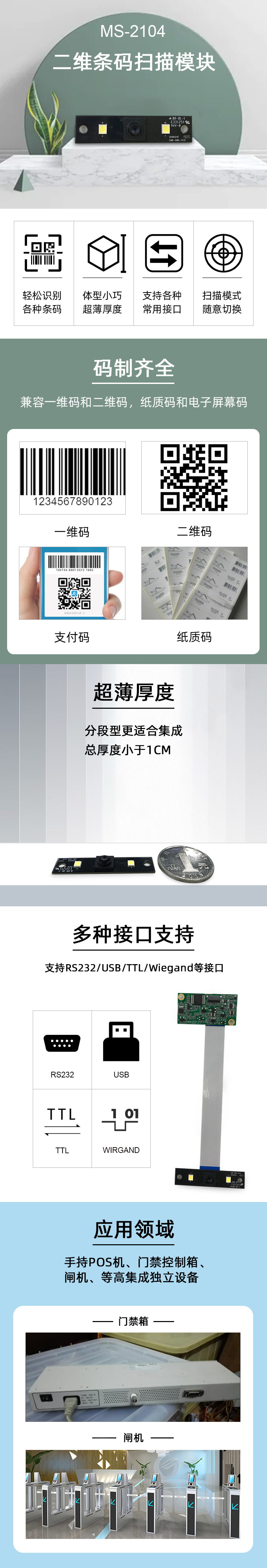 美松固定式二維掃描模組MS-2104掃描采用廣角鏡頭,適合近距離識讀,支持紙質和電子屏,支持全碼制條碼識讀,增加陽光下濾鏡算法,非常適合門禁和陽光下的應用.自帶補光燈,無需另外配備.采用鏡頭和解碼板分離,厚度低于1CM,結構更自由,非常適合超薄結構件的設計.豐富接口類型兼容USB,RS232,485,TTL3.3/5V,韋根;寬壓設計3.3-16V,寬溫設計,支持-30~70℃環境下使用.
