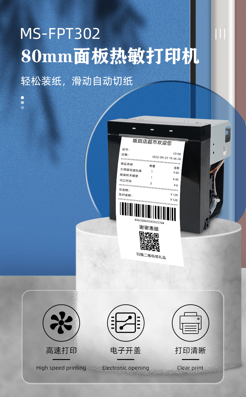MS-FPT302是一款面板嵌入式自助打印機,專業的熱敏票據打印機,用于醫療、零售、政務等行業的自助終端設備。水平面蓋嵌入,高端大氣,無人值守打印機適配無人無接觸式服務設備。
