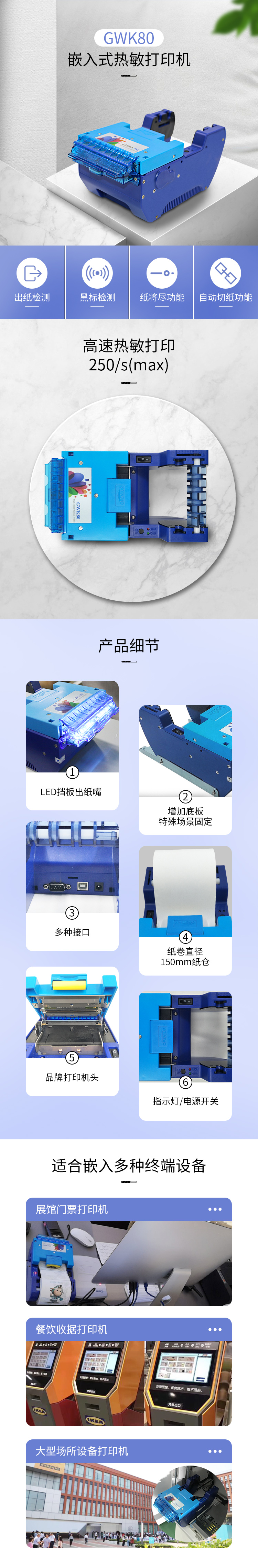 GWK80自助零售餐飲收銀小票機(jī),票據(jù)單據(jù)收據(jù)專用打印機(jī) 送貨單銷(xiāo)貨單打印,80mm熱敏打印機(jī),可打印80毫米或82.5毫米的紙寬,入紙口與出紙口水平出紙,為走紙?zhí)峁╊?lèi)似機(jī)場(chǎng)跑到的場(chǎng)地,極大限度保證走紙順暢,避免打印卡紙,降低打印故障,防堵防拽LED擋板出紙嘴,隨時(shí)檢測(cè)走紙情況,黑標(biāo)檢測(cè)功能,檢測(cè)黑標(biāo)位置并實(shí)現(xiàn)打印,適用于電影院和彩票等行業(yè).GWK80適用于打印量大、打印內(nèi)容特殊化、票據(jù)格式多樣化等行業(yè)的應(yīng)用,應(yīng)用場(chǎng)景多見(jiàn)于醫(yī)院、銀行、政務(wù)、交通等人流量較多的行業(yè)。