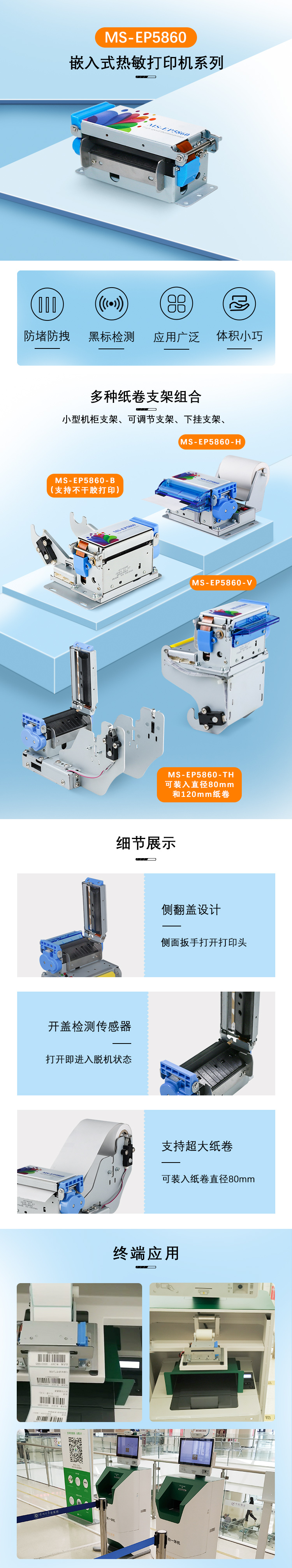 4.兼容各種苛刻的適用環境,結構設計可定制衍生,實現易維護易安裝,整機尺寸小巧靈活,支持紙卷后放MS-EP5860-V或下放MS-EP5860-H結構,根據終端設備的需求選配。