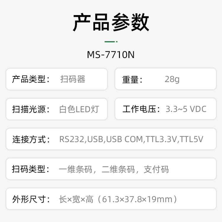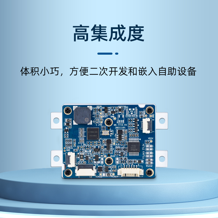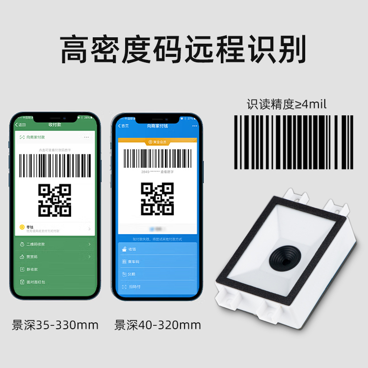 兼具一維/二維碼;紙質和手機碼掃描 超薄19mm,窗口4cm*3cm更宜集成 漫反射補光 高集成度,集成蜂鳴器,補光燈,端子接口在一塊板上,更穩定 3.6-6V寬電壓設計,ESD保護電路 OCR身份證識讀(選配)