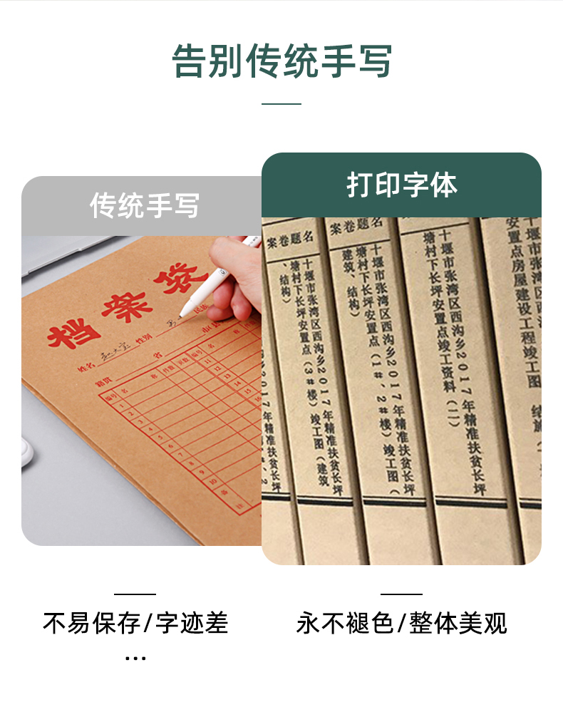 熱轉印打印機原理:熱轉印技術利用碳帶介質通過熱敏片遇熱和壓力轉印到紙或薄膜的過程,當卷宗卷皮的單張空白版面牛皮紙,無酸紙,證件內頁紙通過打印機的打印頭和壓軸時,將碳帶上的碳粉轉印到標簽上, 最終形成文字或圖案。