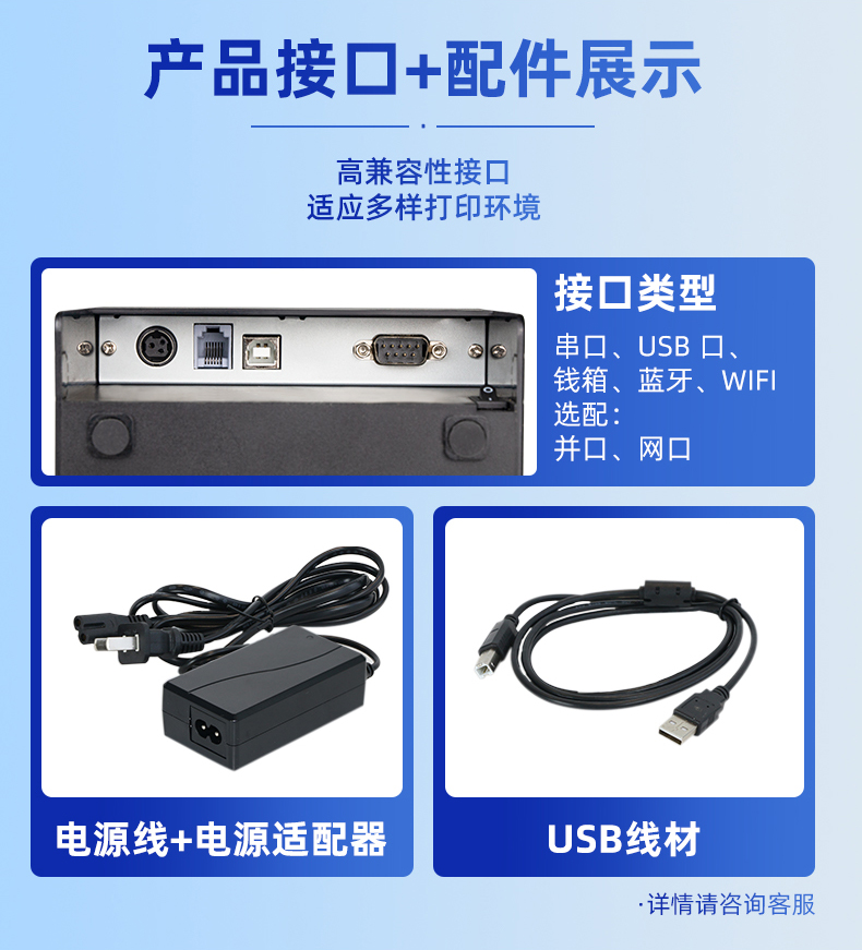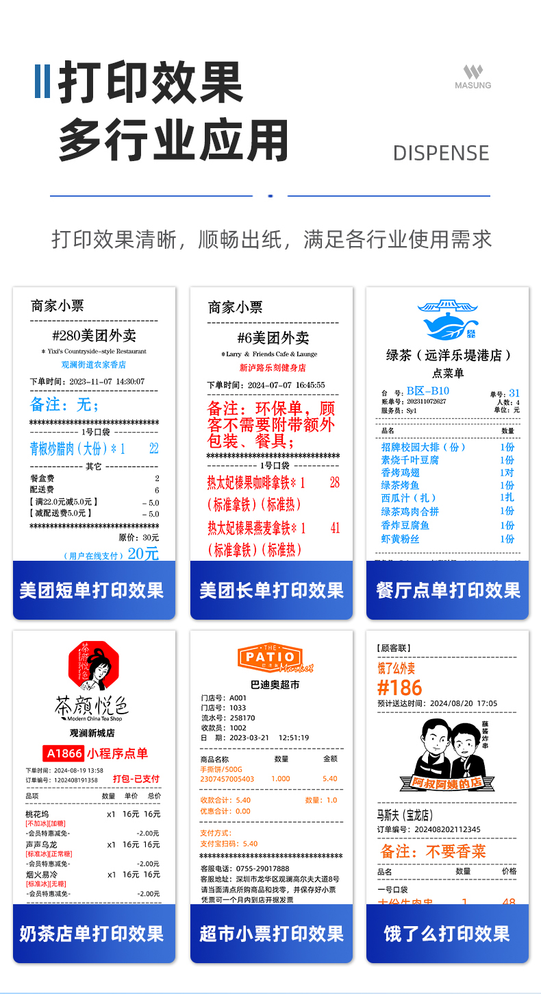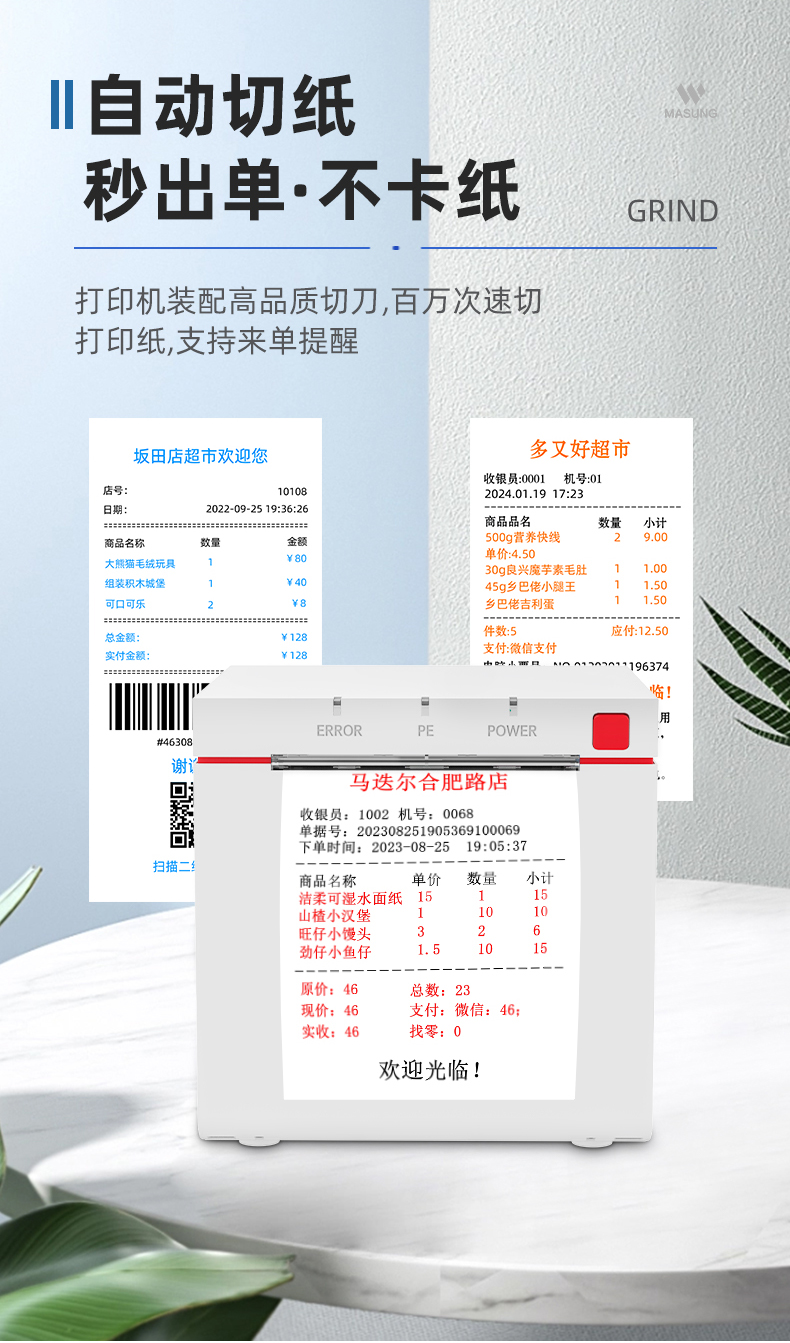 MD80I是一款高顏值的可桌面也可壁掛的票據打印機。MD80I外形四四方方的,圓潤一體設計、簡于外,精于內。流線造型,外觀簡潔大方。顏色搭配顯得更加干凈整潔,可內嵌于一些自助ai設備上,也可直接進行使用。MS-MD80I是一款全能的桌面式壁掛式票據打印機,適用于零售商超、中小電商、倉儲物管、影院娛樂等行業領域,支持簡體/繁體、英/日/韓文多種國際語言,新零售、跨境電商、影院更適合。MS-MD80I擁有超高速打印速度,采用高級強勁機芯,打印速度可高達250MM/S成為市面上同類產品中快速打印的佼佼者,清晰穩定與高速皆可兼得帶來顧客滿分體驗。MS-MD80I擁有豐富的可選接口,支持RS232串口、USB、網口,可選配藍牙、WiFi等接口、同時支持24V錢箱接入、滿足不同的連接需求。專業黑標定位功能,前出紙打印,無線連接,藍牙接口連接,WiFi接口連接,USB連接,打印機外殼材質高端,內置機芯打印速度快。