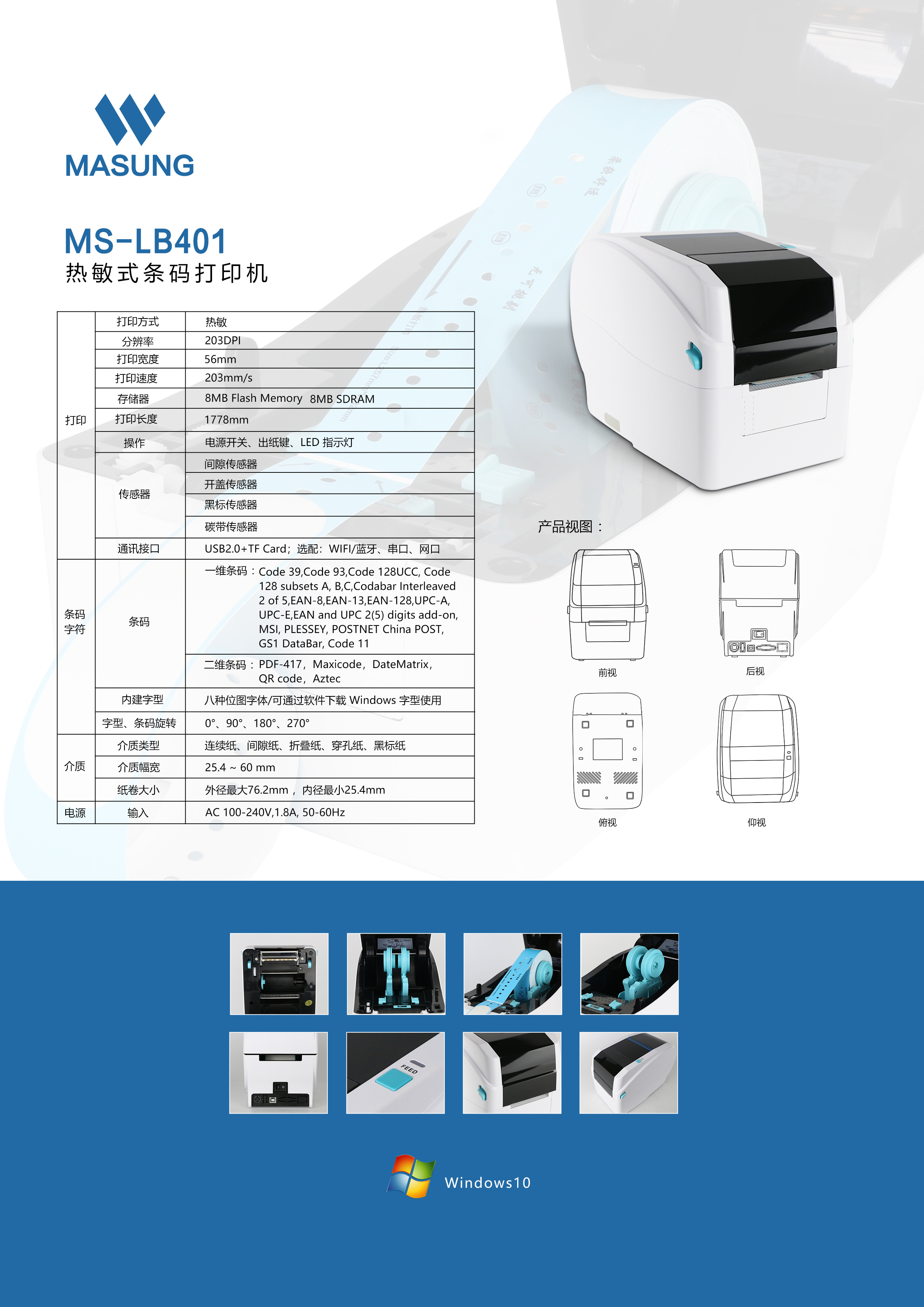 MS-LB401具有多種接口類型,可通過藍牙,WIFI和網口、串口等多種方式進行連接傳輸,可使用的打印介質有腕帶紙和連續紙、間隙紙和折疊紙、穿孔紙和黑標紙
