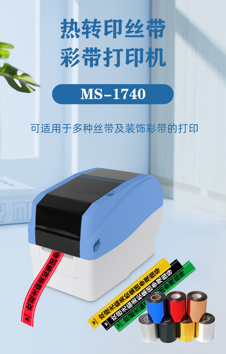 MS-1740桌面式絲帶打印機是由美松自主研發的一款絲帶彩帶飄帶打印機,MS-1740的寬度為最小26mm,最大寬度為54mm,可適用的絲帶彩帶范圍廣泛,應用于禮物包裝絲帶,節日活動絲帶等領域