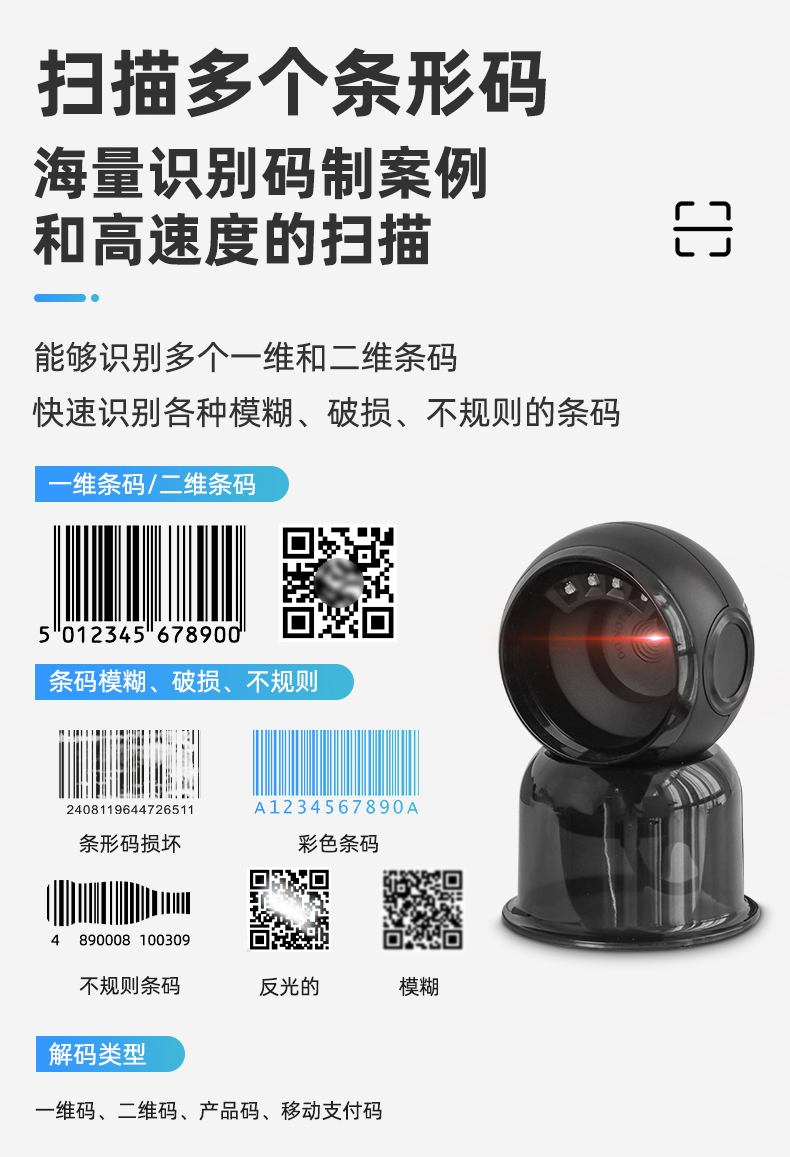 MS-7310_桌面掃碼平臺(tái)有線式 產(chǎn)品特點(diǎn): 領(lǐng)先解碼技術(shù) 采用自主研發(fā)的核心技術(shù),極速響應(yīng), 支持快速開發(fā)和定制需求 高運(yùn)動(dòng)容差 采用全局曝光鏡頭搭配快速抓取技術(shù),可實(shí) 現(xiàn)在運(yùn)動(dòng)過程中快速讀取 褶皺殘缺碼優(yōu)化 對褶皺和殘缺條碼進(jìn)行算法優(yōu)化,條碼可識(shí)讀率更高 紙質(zhì)碼/手機(jī)碼流暢切換 商品碼紙質(zhì)碼和手機(jī)支付碼間自動(dòng)切換,流暢高效 應(yīng)用場景: 新零售、檢票、醫(yī)療等桌面設(shè)備。尤其適合零售商品碼和其他高密、反光、殘缺、褶皺條碼的運(yùn)動(dòng)中讀取。