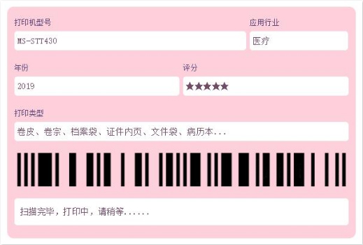 美松公司與醫(yī)療器械行業(yè)的合作案例接連不斷,58mm嵌入式打印機(jī)系列之MS-FPT201K被廣泛應(yīng)用于各類醫(yī)療檢測儀器及泌尿系統(tǒng)自助分析檢測機(jī)中;它具有機(jī)身紙倉一體式設(shè)計(jì)且具有面板式嵌入安裝特點(diǎn),更加便捷的被安裝于各類自助終端內(nèi);支持打印統(tǒng)計(jì)圖表的功能,在醫(yī)療器械輸出信息中具有更加直觀的顯現(xiàn)。產(chǎn)品MS-LP212系列則具有打印分離不干膠功能,被廣泛應(yīng)用于醫(yī)院化驗(yàn)科室設(shè)備中,為化驗(yàn)樣本提供標(biāo)簽打印、快速分離底紙和標(biāo)簽,緩解在科室打印量的壓力。日均人流量過萬的門診部門,病歷打印著實(shí)是一個(gè)使院方管理頭疼的問題,美松公司針對醫(yī)院病歷打印研發(fā)出一系列創(chuàng)新型整機(jī)產(chǎn)品,專門針對不同打印規(guī)格的病歷本設(shè)計(jì)的可調(diào)節(jié)紙倉打印機(jī)MS-STT430系列,采用碳帶熱轉(zhuǎn)印方式針對已印刷的卷皮、卷宗、檔案袋、證件內(nèi)頁、文件袋、病歷本等封面進(jìn)行二次加印的打印設(shè)備。